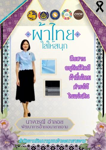 นางดรุณี อำลอย พัฒนาการอำเภอนายายอาม เชิญชวนสวมใส่ผ้าไทย ในทุกๆโอกาส ภายใต้แนวคิด "ผ้าไทย ใส่ให้สนุก" ร่วมสืบสาน รักษา และต่อยอด พระราชปณิธานของสมเด็จพระนางเจ้าสิริกิติ์ พระบรมราชินีนาถ พระบรมราชชนนีพันปีหลวงในการอนุรักษ์ผ้าไทย และงานหัตถศิลป์